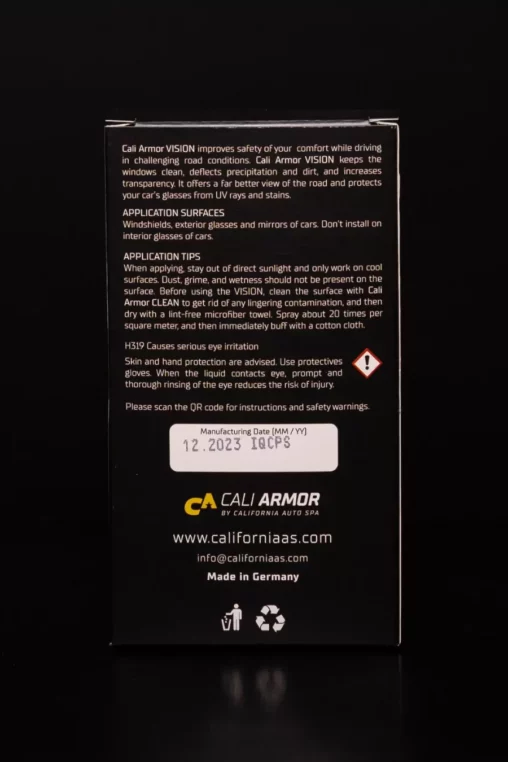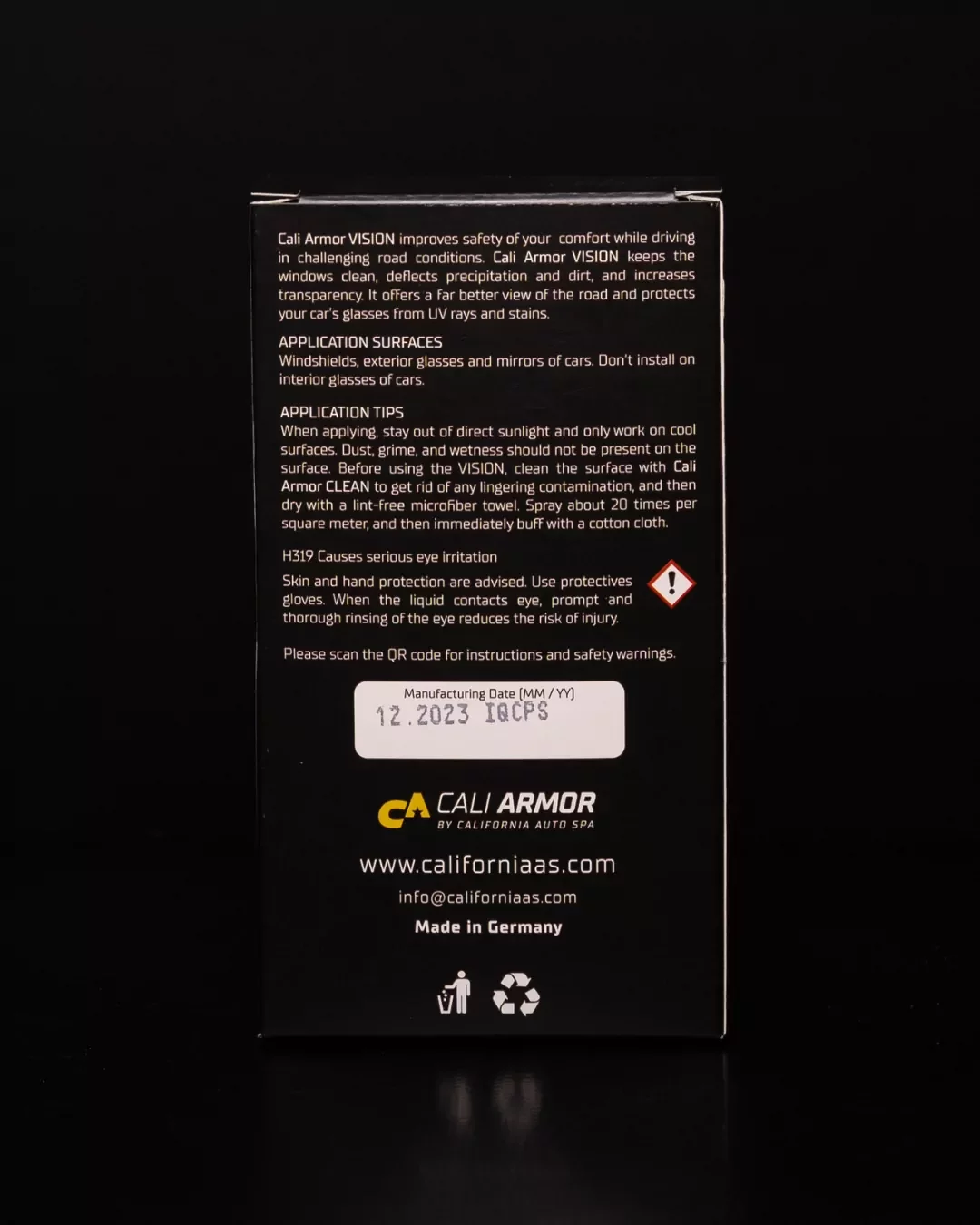 שפרו את הראות שלכם עם CALI ARMOR VISION, הפתרון האולטימטיבי לדחיית מים לשמשות רכב ומשטחי זכוכית. תוכנן במיוחד כדי לשפר את הבטיחות בנהיגה בתנאי גשם ושלג, VISION יוצר שדה ראייה ברור שמפחית את הצורך בשימוש תכוף במגבי השמשה.