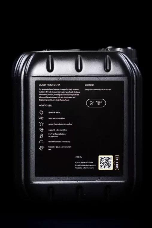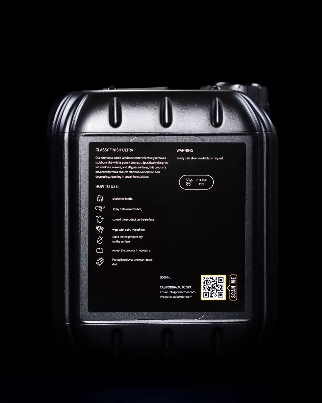 **GLASSY FINISH ULTRA** הוא מנקה שמשות יעיל מאוד, שנוצר במיוחד לאנשי מקצוע בתחום ניקוי הרכב. הנוסחה הייחודית שלו, הכוללת בין היתר אמוניה, מבטיחה הסרה קלה של לכלוך עיקש. למנקה הזה יש יכולת הסרת שומנים חזקה, שזה חשוב במיוחד לחלונות הרכב, שבהם כתמים יכולים לפגוע בשדה הראייה בזמן הנהיגה. הוא מתפזר בקלות, מתייבש מהר ולא משאיר סימנים, ומשאיר חלונות נקיים וברורים.