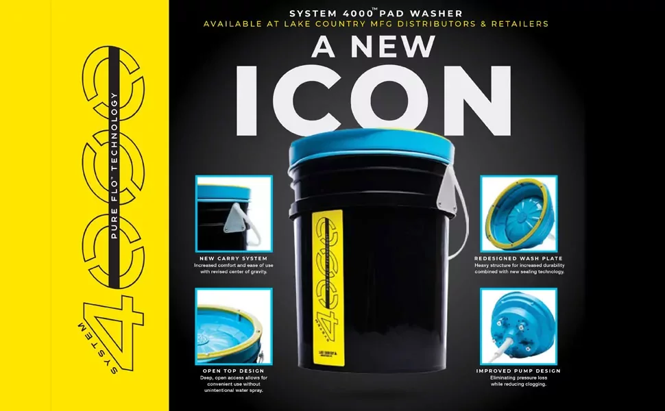 מותאם לעבודה קשה – מערכת Lake Country 4000 עם מכסה פתוח כוללת צלחת שטיפה מחורצת ומשאבה חזקה ששולטת על זרימת הנוזל. בפנים יש מנגנון שמקרצף את הפד לעומק ומחזיר לו ביצועים כאילו חדש – תוך שניות.