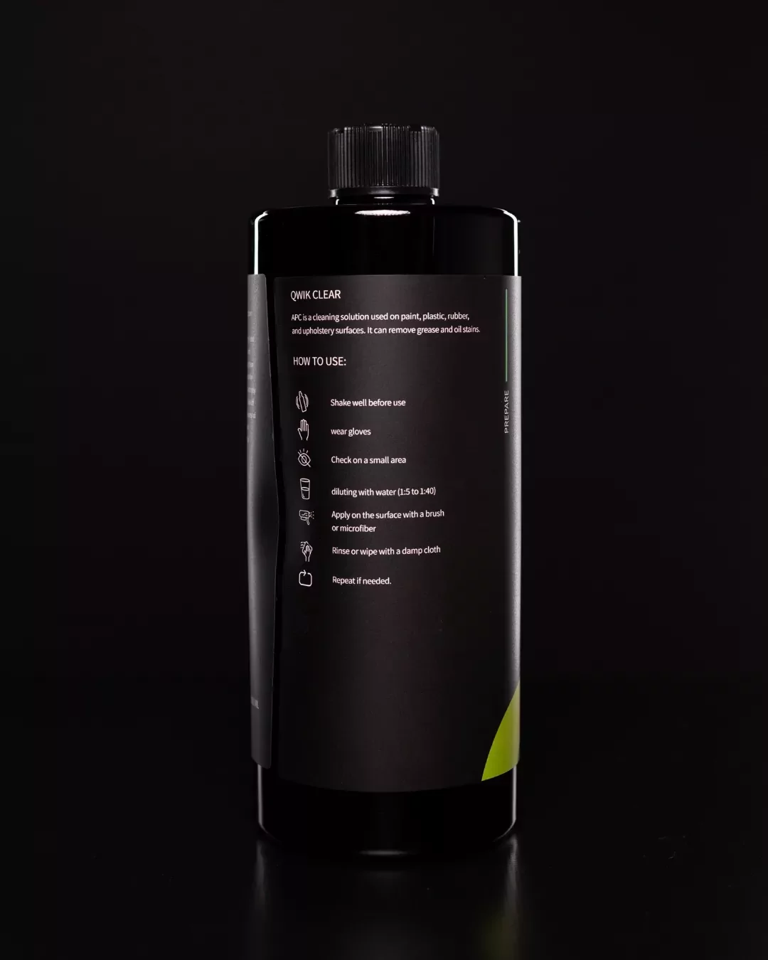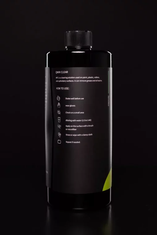 APC is a cleaning solution used on paint, plastic, rubber, and upholstery surfaces. It can remove grease and oil stains. Before using, check on a small area and wear gloves. Shake well before diluting with water (1:5 to 1:40). Apply on the surface with a brush or microfiber. Rinse or wipe with a damp cloth and repeat if needed.