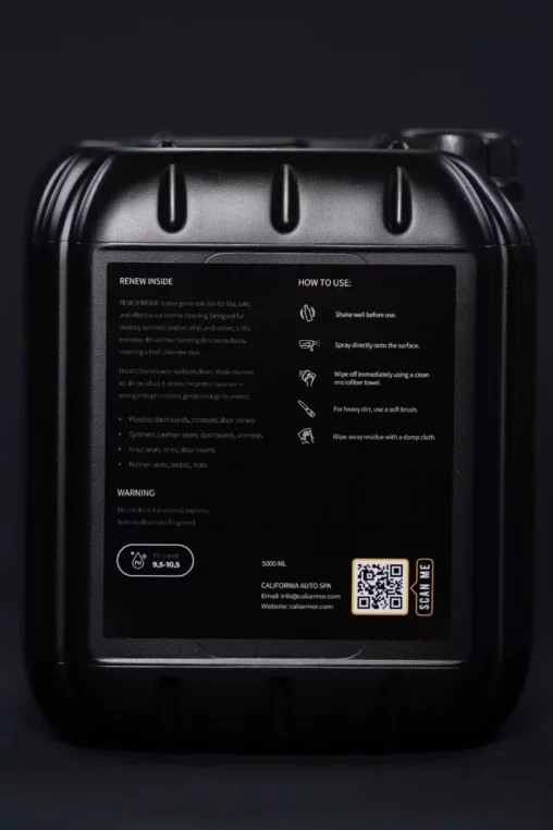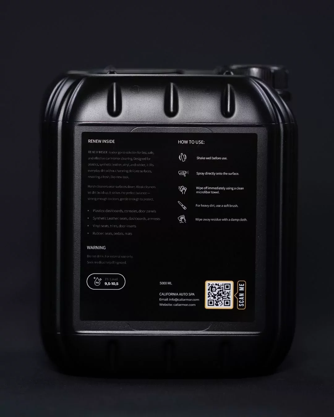 RENEW INSIDE is a fast, professional interior cleaner designed for regular maintenance. It safely removes daily dirt, oils, dust, and grime—restoring a clean, factory-fresh interior appearance without harsh residue.