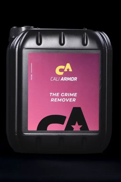 The Grime Remover by Cali Armor, a powerful solution for professional car detailing. This formula lifts road grime from paint, rims, and tires, ideal for pre-washing.