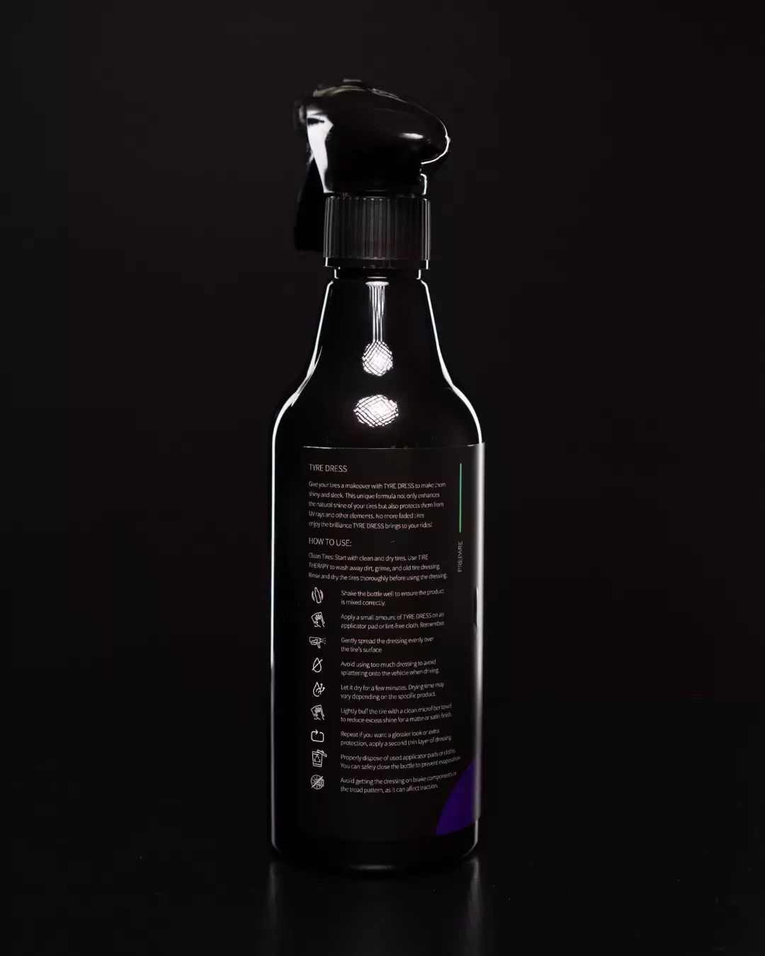 Revitalize your tires with TYRE DRESS for a sleek, polished look. Our advanced formula enhances tire luster and provides long-lasting UV protection.